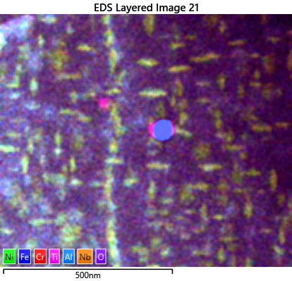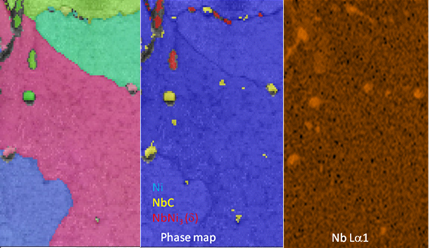 Other phases can form in the printing process, such as niobium carbides and nickel niobium. Both phases are niobium rich and have similar crystal structures making them difficult to distinguish by EBSD or EDS alone, the use of simultaneous EDS and EBSD enables them to be differentiated.