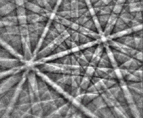 As is often the case, the final story is not as simple as we might have first thought. It is only when we start looking at the compositional variations in the Ni alloy that the true story emerges – the relative abundances of Ni, Fe, Ti and even C all explain the changes in physical properties in different areas of the sample. Perhaps the most interesting of all is the carbon content within the Ni: we know that C exists as an interstitial species in the face centred cubic (FCC) Ni structure, resulting in distortion of the lattice and localised hardening / embrittlement. This, in turn degrades the quality of any EBSD patterns from these C-enriched areas: we can see this visually as a blurring of the Kikuchi bands (as shown below) but it also changes the lattice parameters (e.g. the c/a ratio of the crystal lattice).
