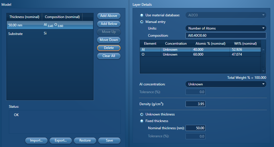 The sample that we have is a thin film of Al2O3 on a substrate of Si. We know that the thickness of the layer of Al2O3 is somewhere between 40 and 60nm thick – you can try this yourself with the demo data in AZtec. We start off by creating a model of the layer structure – specifying that the substrate is Si and that it is overlain by the Al2O3. We enter in the nominal structure of the sample and the density of the of the Al2O3 layer – you can see what this looks like in AZtec below.