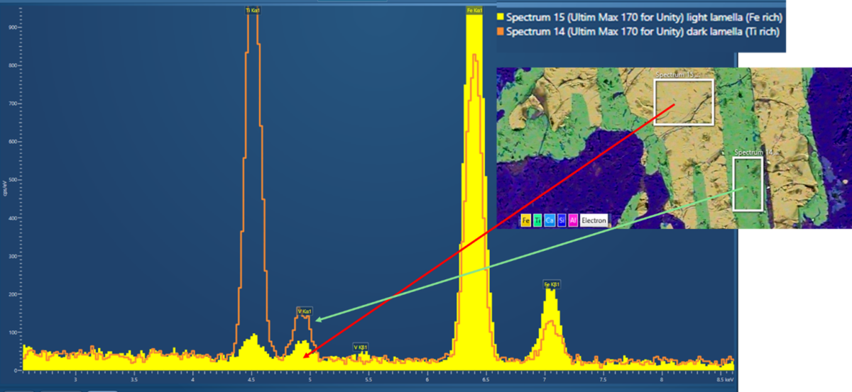 We spotted some low levels of vanadium in this data. It’s known that vanadium overlaps with titanium in EDS. In order to deal with this, I applied AZtecLive’s TruMap option to deconvolute these elements and therefore check where the V signal was coming from. Results showed that the signal remained but was at a low level. I noticed that there were exsolution lamellae present that appeared different in the Unity BSE image, so I extracted spectra from dark lamella (Ti rich) and light lamella (Fe rich) regions of the map to compare V intensity. From these EDS spectra, I could conclude that the darker lamella contained more V. Given the EDS overlap I mentioned above, however, I wanted to check that this information was correct. Ti rich lamella could seem to have more V because Ti peak could give us false positive for V.