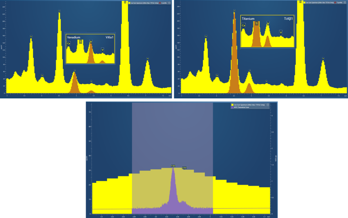 In order to confirm these results, I decided to use WDS. I could check the relative signals for Ti and V using the WDS scan functionality. This allows us to collect a WDS spectrum from a selected portion of an EDS spectrum. Figure 3 shows the corresponding EDS spectrum (top figures) and the peak profiles for both V and Ti. The bottom figure is highlights how higher spectral resolution of WDS can resolve Ti Kb and V Ka overlap, while EDS spectrum in yellow cannot distinguish them. In Figure 3, the theoretical WDS spectrum is shown in purple and shows us what kind of resolution we can achieve with WDS spectral scan even before starting any acquisition.