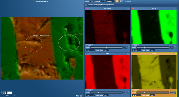 When we perform WDS mapping, we simultaneously acquire EDS for a much longer time than we would in a single frame acquisition, as in Figure 2. This means that we can build even better EDS statistics, so that when we switch on TruMap correction, we have excellent confidence when applying corrections for the overlaps (Ti and V), and therefore know that we will get the correct V distribution (Figure 4).