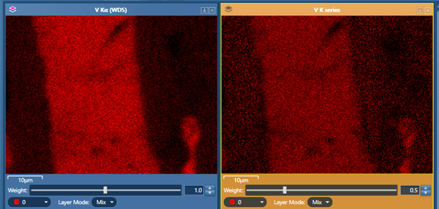 Figure 4 (Left) WDS mapping data highlights the true V distribution, but (Right) EDS TruMap corrections also display the correct distribution.