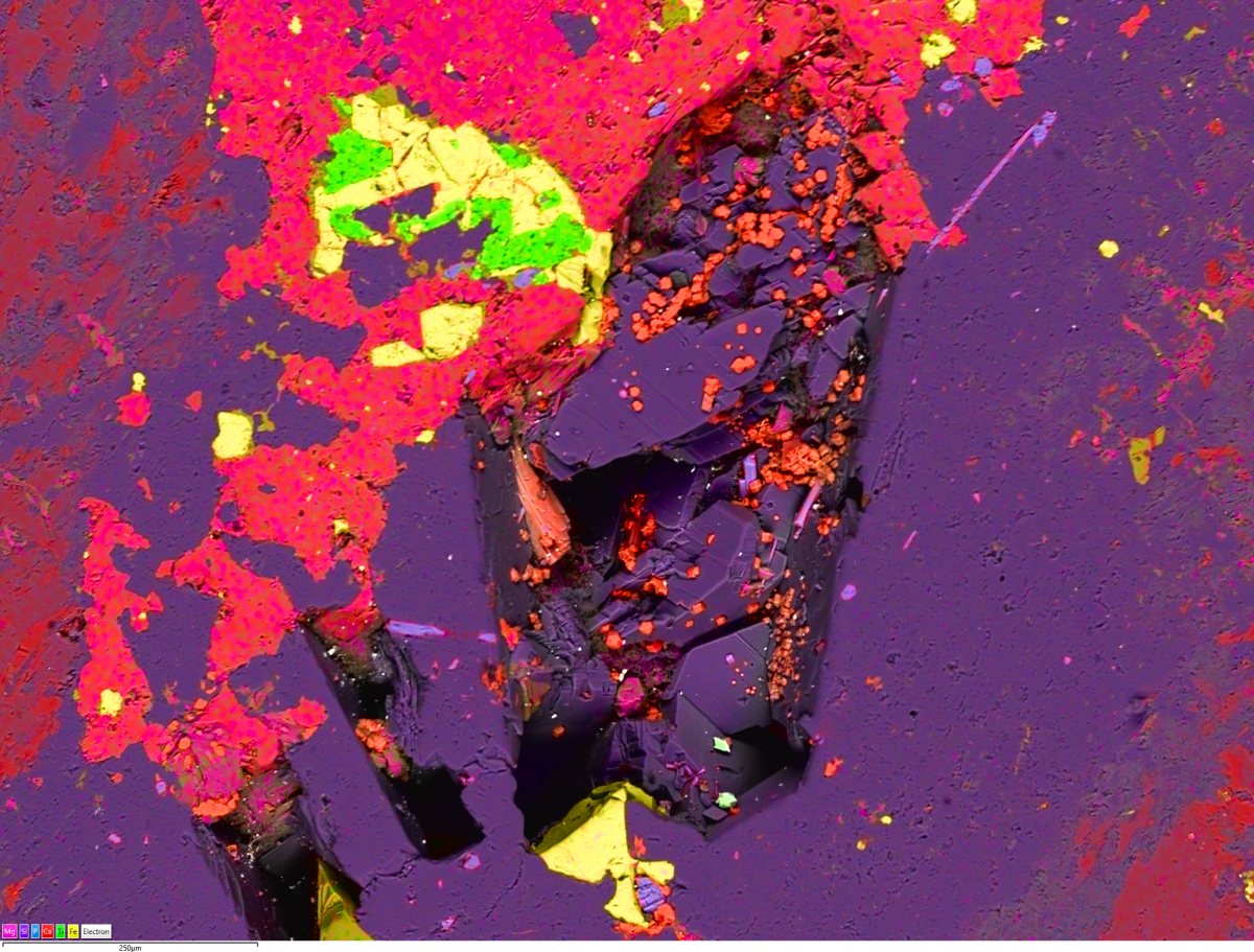 I continued exploring the sample and decided that I wanted to collect some EDS information from within the cracks. This is not usually possible with conventional EDS due to the angle that the detector is mounted at – this causes shadowing. You can see in the video below how quickly I was able to collect high quality maps within the crack. I found this really quite amazing, and it made me feel almost like an artist (Figure 5). Analytical Microscopy can be a truly artistic technique!!