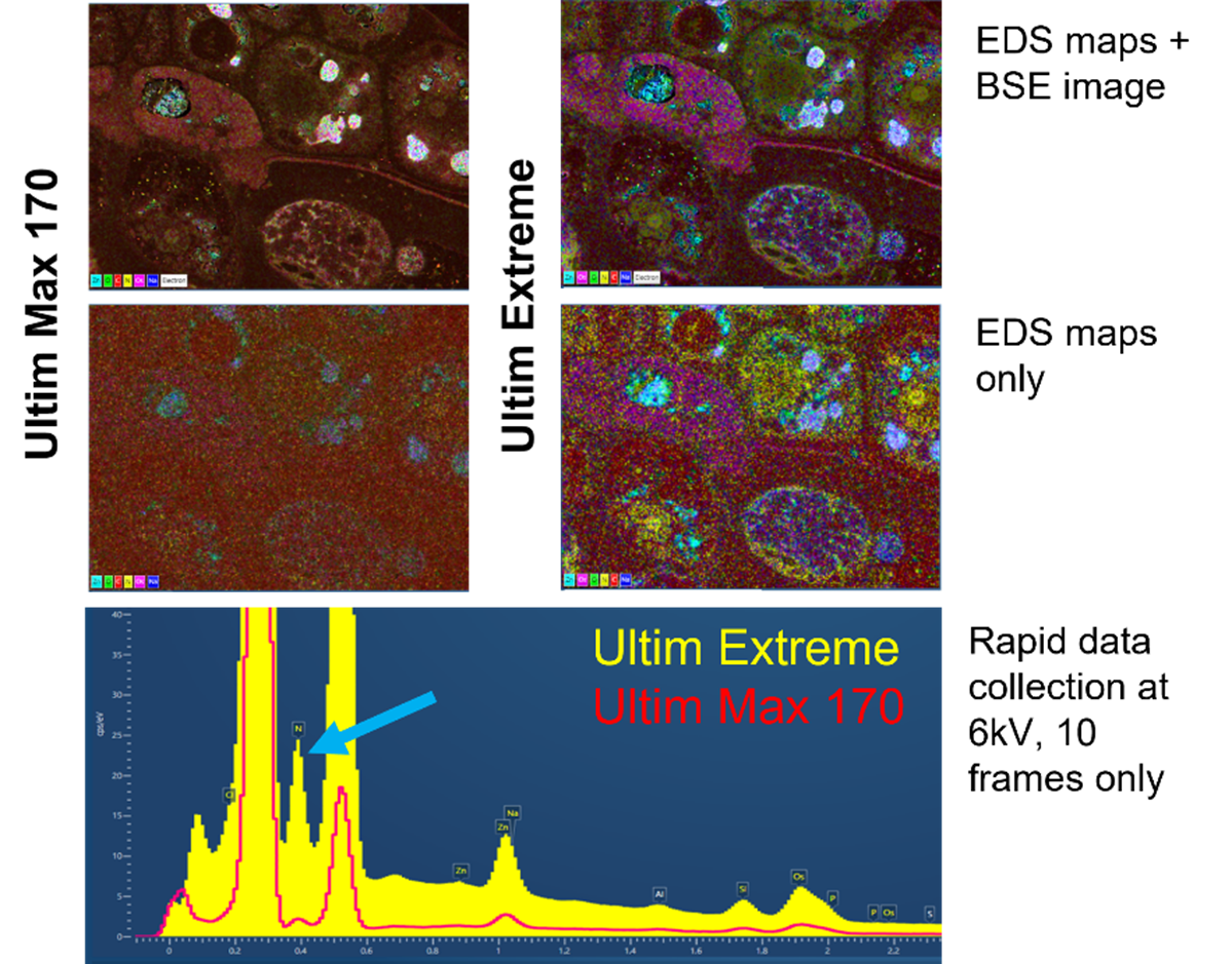 Figure: A comparison between the Ultim Extreme detector and the Ultim Max 170 showing maps and spectra taken of a resin embedded Venus’ fly trap leaf and gland. Note the improved signal in the Ultim Extreme maps and in particular the yellow signal, which is nitrogen. There is a far more obvious nitrogen peak (blue arrow) in the Ultim Extreme spectrum (yellow) compared to the Ultim Max 170 (red).