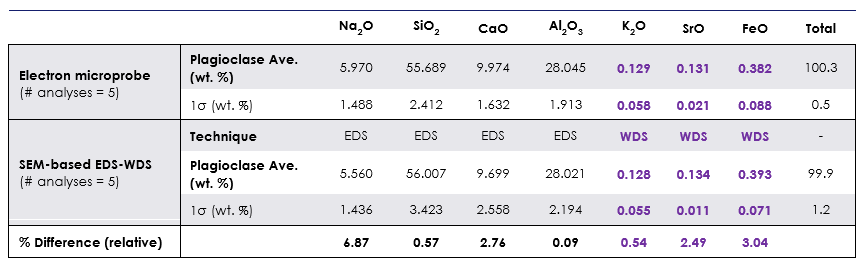 The average plagioclase feldspar composition determined by electron microprobe and SEM-based combined EDS-WDS are presented in the table below. In both cases the quantitative results are shown as unnormalized, with oxygen calculated by stoichiometry, and the elemental abundances presented as oxide wt. %. The minor elements are highlighted in purple and the percentage relative difference between the two techniques is found to be ≤3 %.