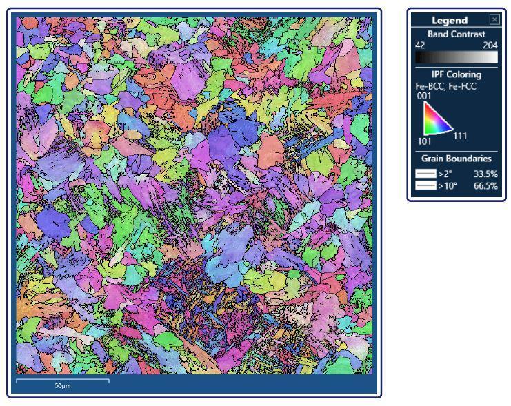 - Band Contrast: carte de qualité du cliché qui révèle clairement les limites des grains et certaines microstructures de l'échantillon, y compris les zones de forte contrainte.