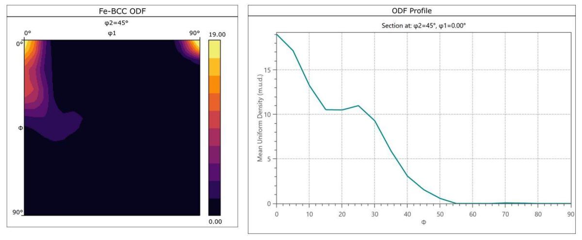 Figure 1. Graphique de texture ODF pour Fe-BCC dans un acier duplex laminé. Gauche - section unique (φ2 = 45°) à travers l'espace d'Euler ODF montrant le développement d'une texture {001}<110> (densités dans les coins supérieurs) et d'une texture de fibre α