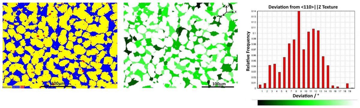 Figure 1. Analyse de texture d'un échantillon de laiton au plomb. Gauche – carte de phase ; rouge - plomb, jaune - α-laiton, bleu - β-laiton. Centre – carte montrant la force du <110> || Texture dans la direction Z dans le laiton β. Droite – clé de couleur pour la texture β-laiton montrant l'écart par rapport à l'idéal <110>|| texture.