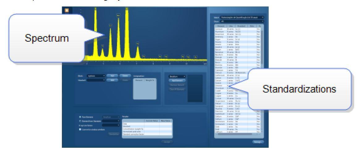 L'analyse quantitative peut être effectuée sans qu'il soit nécessaire de mesurer les matériaux standard puisque votre système est fourni avec un ensemble complet de standardisations par défaut. Cependant, dans des cas précis, l'utilisation de vos propres normes conduira à une amélioration de vos résultats quantitatifs. L'objectif de Standardize (Figure 1) est donc de vous permettre de définir vos propres normes d'analyse quantitative.
