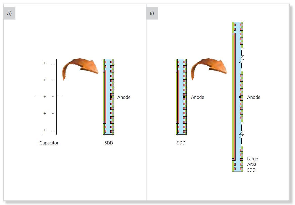 Figure 2. A) La capacité d'un détecteur EDS est proportionnelle à la surface de ses électrodes. Dans le cas du SDD, la surface avant étant sa cathode et son anode étant une petite zone sur la surface arrière où le champ de dérive est focalisé. B) Si la surface du détecteur est augmentée sans changer la taille de l'anode, les mêmes performances de capacité et de résolution peuvent être obtenues avec un taux de comptage élevé.