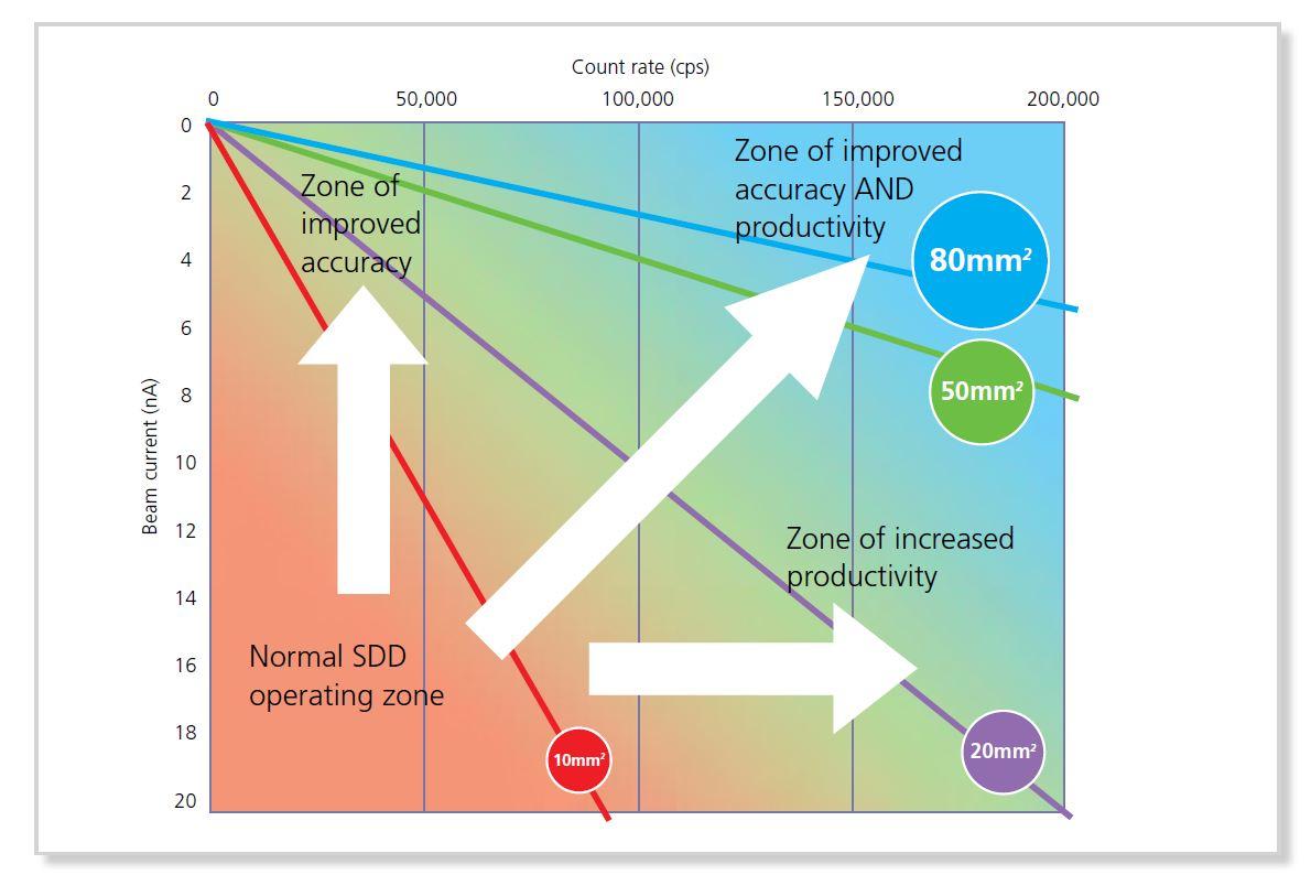 Les détecteurs SDD possèdent un avantage important car ils maintiennent les meilleures performances de résolution à des taux de comptage beaucoup plus élevés que pour un détecteur Si (Li). Une productivité plus élevée est obtenue en collectant les données plus rapidement sans perte de performances analytiques. La collection de spectres peut prendre quelques secondes au lieu de plusieurs minutes et l'acquisition de cartes de rayons X se compte désormais en minutes et plus en heures. Cependant, beaucoup plus de rayons X doivent être générés et collectés pour que les avantages de productivité de la technologie SDD soient réalisés. Pour les détecteurs SDD 10-30 mm² avec la même taille que les détecteurs Si (Li) traditionnels, cela signifie utiliser des courants de faisceau significativement plus élevés dans le microscope électronique, Figure 1. Bien que cela soit possible pour certaines applications sur des échantillons stables, c'est contre-indiqué, difficile ou impossible pour les échantillons sensibles au faisceau, instables et facilement contaminés, ou pour la nano-analyse à basse tension où beaucoup moins de rayons X sont générés.