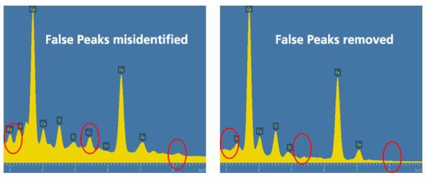 Figure 1. Spectres collectés à partir d'un échantillon multiphase complexe lors de la cartographie AZtecLive à un taux de comptage élevé. Le premier spectre comprend une fausse identification d'élément due à l'accumulation d'impulsions, par ex. Cr qui est Si+Ca. Le deuxième spectre a été corrigé par l'algorithme unique basé sur le regroupement de phases d'AZtecLive qui supprime ces artefacts et les fausses identifications d'éléments.