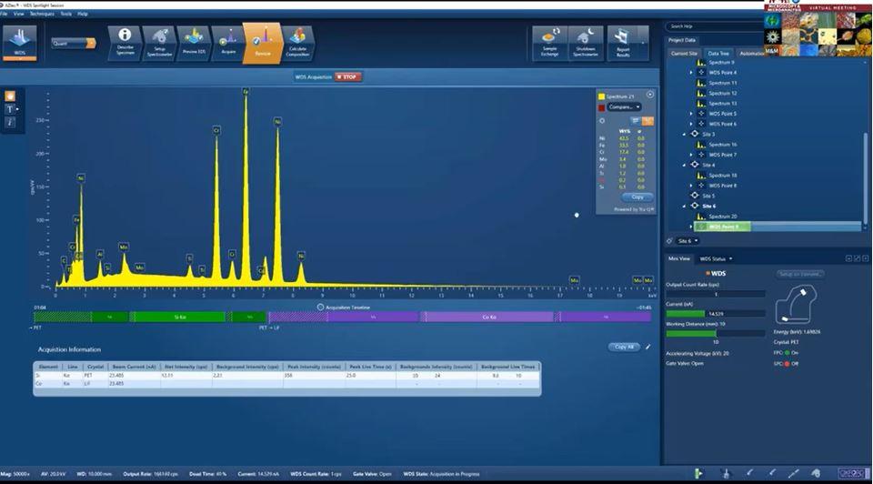 Une différence majeure entre le WDS et l’EDS est que le WDS mesure une énergie de rayons X (c'est-à-dire une ligne d'élément) à la fois, tandis que l’EDS collecte simultanément le spectre d'énergie complet. Cela fait du WDS une technique plus lente par rapport à l'EDS, en particulier lors de l'utilisation d'un seul spectromètre WD. Notre solution pour rendre plus efficace l'analyse compositionnelle à l'aide d’un MEB-WDS consiste à la combiner avec EDS.