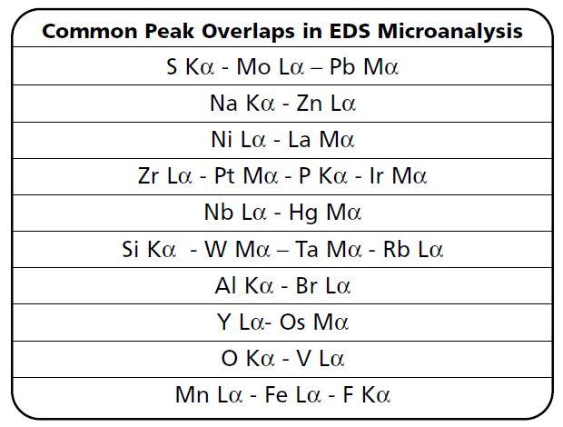 Le spectromètre WDS peut acquérir un taux de comptage élevé des rayons X produits à des courants de faisceau élevés, car il mesure une seule longueur d'onde à la fois. Ceci est important pour l'analyse des éléments traces. La résolution du détecteur EDS est telle que des situations peuvent survenir dans lesquelles le chevauchement de pics adjacents devient un problème. De nombreux chevauchements peuvent être traités par déconvolution des pics. D'autres cependant, sont plus difficiles, en particulier s'il n'y a qu'une petite quantité de l'un des éléments superposés. Des exemples de ces situations de chevauchement plus difficiles sont répertoriés dans le tableau ci-dessous.