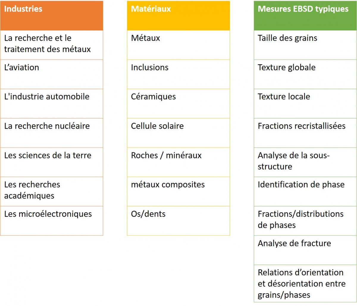 L'EBSD est désormais une technique bien établie pour évaluer les informations cristallographiques et est utilisée dans de nombreux domaines pour l'analyse de caractérisation des matériaux, comme décrit dans le tableau ci-dessous. La préparation des échantillons est essentielle dans l'analyse EBSD. Un guide à ce sujet peut être trouvé en anglais sur ebsd.com. Les articles de blog suivants serviront d'introduction à la configuration EBSD, aux échantillons appropriés pour l'analyse EBSD et aux résultats générés à partir de l'analyse EBSD.