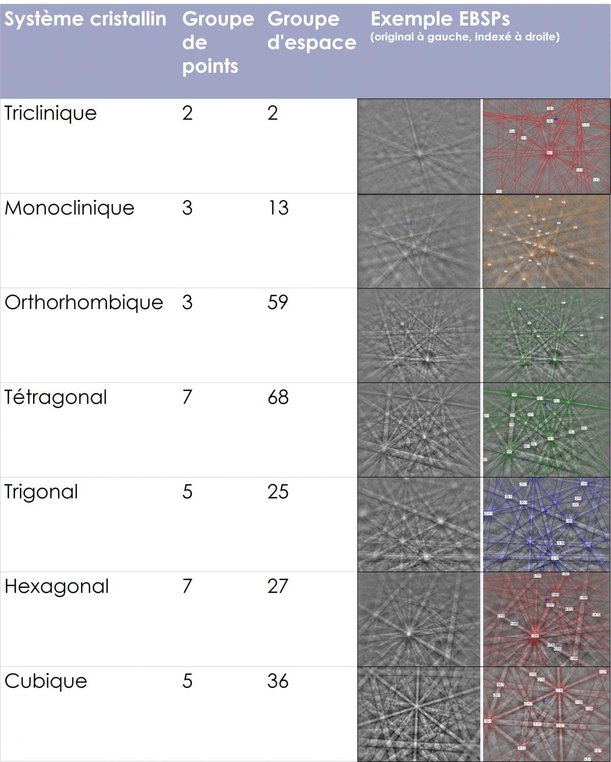 Figure 3. Les 7 systèmes cristallins et les exemples d'EBSP.