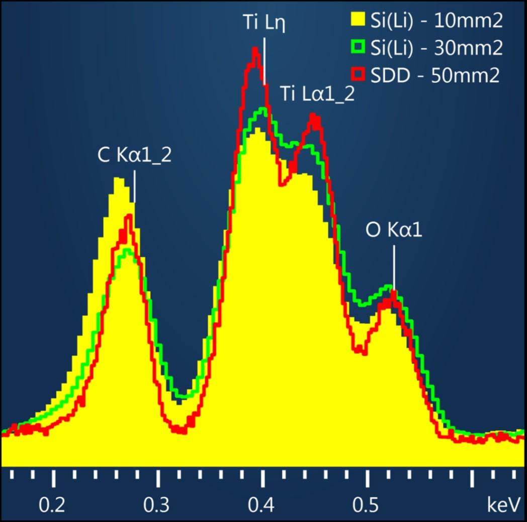 La détection des éléments légers est possible grâce aux progrès de la résolution à faible énergie, à l'augmentation de la taille du capteur et à l'amélioration de l'efficacité de la détection des rayons X. La résolution basse énergie s'est améliorée grâce à la réduction du bruit du détecteur et à l'utilisation de détecteurs SDD qui offrent une meilleure collecte de charge. La preuve d'une résolution améliorée est vue ci-dessous sur la figure 1 où la détection de la ligne TiL à 0,4 keV est comparée à l'aide d'un détecteur de 10 mm² Si (Li), d'un détecteur de 30 mm² Si (Li) et d'un détecteur SDD de 50 mm². En utilisant les détecteurs SiLi, les deux lignes TiL ne peuvent pas être séparées. En utilisant le détecteur SDD, deux pics distincts sont identifiés. L'augmentation de la taille du capteur pour le détecteur SDD a amélioré la résolution à faible énergie permettant une cartographie x à 1 keV d'une taille inférieure à 50 nm. L'efficacité de la détection par rayons X peut être augmentée en supprimant la fenêtre de polymère dans le détecteur EDS ce qui a été vu dans ce blog. Un détecteur sans fenêtre a une atténuation réduite des rayons X, des intensités plus élevées pour les rayons X à faible énergie et des gains plus élevés à basse énergie. Une comparaison entre les détecteurs traditionnels et sans fenêtre a été traitée dans ce blog.