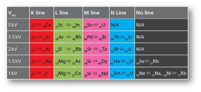 Figure 2. Tableau de la transition des rayons X excitables la plus élevée en fonction de la tension d'accélération. Les éléments de la colonne sans ligne ne peuvent pas être excités et ne produiront pas de rayons X à cette tension d'accélération.
