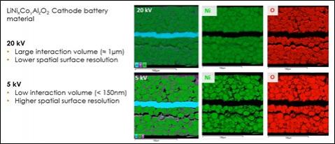 Figure 2. Matériau de la batterie cathodique LiNixCoyAl2O2. À 20 kV, il y a un grand volume d'interaction du faisceau (≈ 1 µm) qui se traduit par une résolution de surface spatiale plus faible. À 5 kV, il y a un volume d'interaction de faisceau plus faible (<150 nm) qui se traduit par une résolution de surface spatiale plus élevée pendant la cartographie élémentaire comme on le voit ici dans les cartes Ni et O.