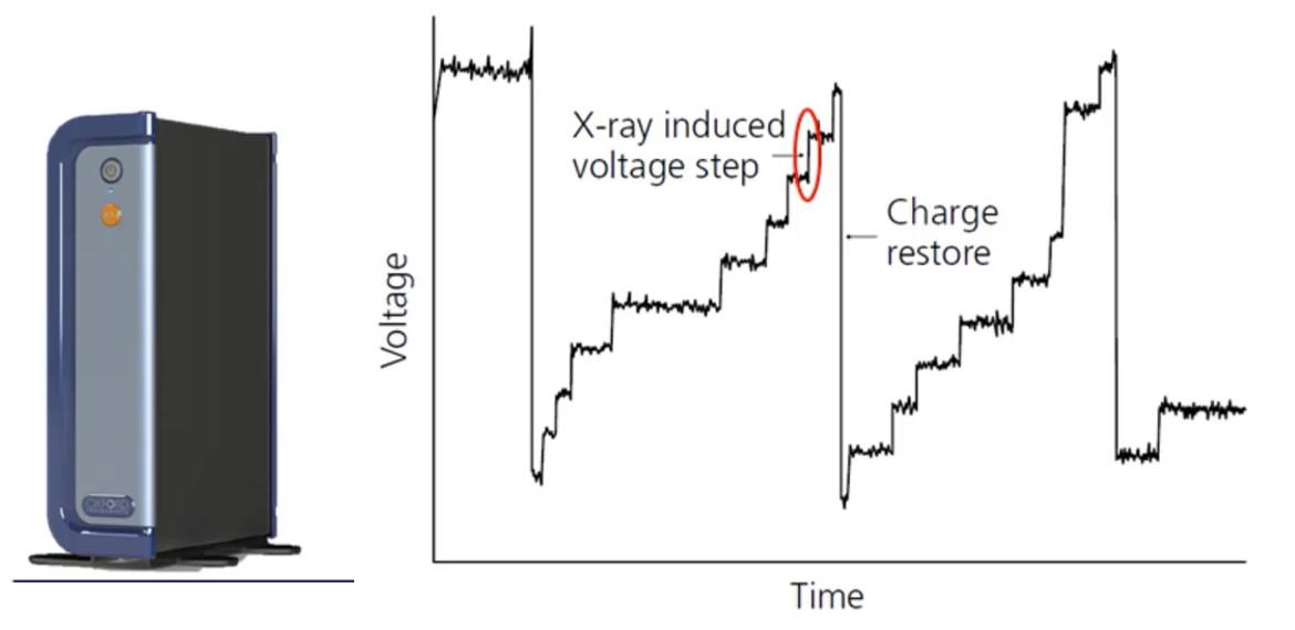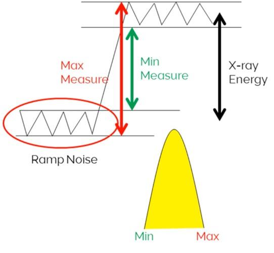 Le processeur d'impulsion mesure l'énergie des rayons X. Chaque rayon X génère un signal/une impulsion sur la rampe de tension, figure 2, et la hauteur de l'impulsion est proportionnelle à l'énergie du rayons X incident.