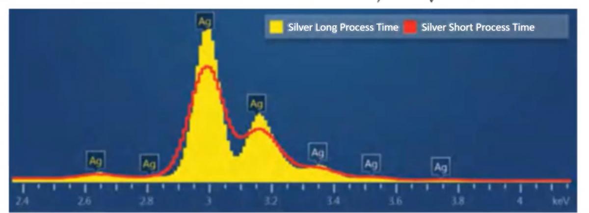 Le processeur d'impulsion va convertir cette impulsion (marche d'escalier) en un numéro de canal: L'utilisateur peut choisir, parmi une liste de valeurs, le temps passé à traiter une impulsion: c'est le temps de mise en forme (Process time en anglais). Plus la valeur du temps de mise en forme est élevée, meilleure est la résolution des pics et donc la séperation entre deux pics. Ceci est illustré en figure 3 où l'on peut voir deux spectres EDS acquis sur un échantillon d'Argent l'un avec un temps de traitement long (spectre en jaune), le second (superposé en ligne rouge) avec un temps de traitment court.