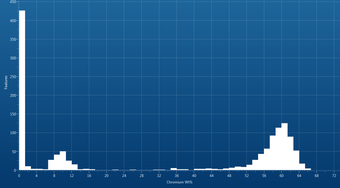 The entire stub is then analysed in an automated particle analysis run to ensure that every particle on it is found and characterised.  The image below shows a montaged image from a stub with an area of 108 mm2 which held particles which had been collected from a suspected weapon – analysed in approximately 37 minutes. 1297 particles were found on the stub of which 876 were determined to be Fe-Cr particles – i.e. a stainless steel – consistent with the material the knife was known to be made of.  The nature of the population of particles was then studied.  The histogram below shows that the knife generated multiple types of Cr-containing particles with notable groupings of particles with approximately 60wt%, 10wt% and 1wt% Cr within them respectively. By comparing both the composition of individual particles and the shape of the overall population (in terms of a variety of measured parameters) to samples collected from the victim, a comparison can be performed allowing a determination to be made on whether or not the weapon could have been used in the incident in question.