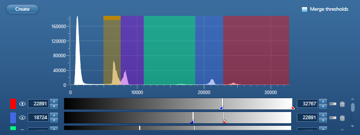 You also have a couple of other options available to you to create thresholds. The first option is that you can simply click “Create” at the top left of the thresholding box – this will make a threshold in the middle of the available range which you can edit yourself.