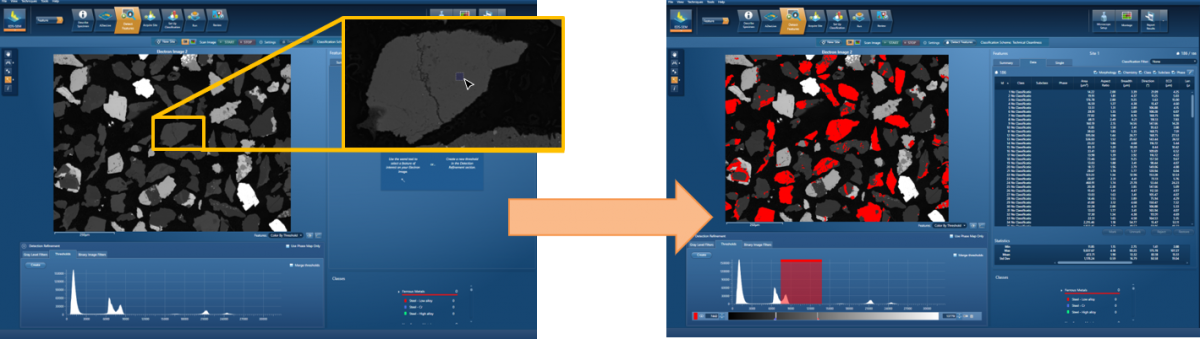 One of the key parts of automated feature analysis is the first step – determining where the feature is. This is something that the human eye is very good at – you can see the difference between a feature and the material it is mounted on easily. In AZtecFeature our standard approach is to identify where a feature is from using an electron image collected with the SEM using grey level thresholds.