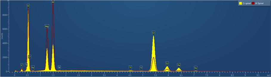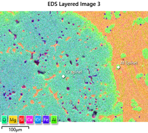 I often use a slag sample which contains large numbers of spinels of varying composition. Spinels are great because their composition is predictable. They have the formula AB2X4, where A are divalent cations (e.g. Iron, Magnesium, Manganese and Zinc), B are trivalent cations (e.g. Chromium and Aluminium) and X is oxygen. This means that in atomic % Oxygen should be 57.1%, Mg+Fe 14.3% and Al+Cr 28.6%. With this information I can take this sample to any system and check its ability to accurately analyse this type of material, giving me high confidence for the analysis of minerals, ceramics, steel inclusions etc.