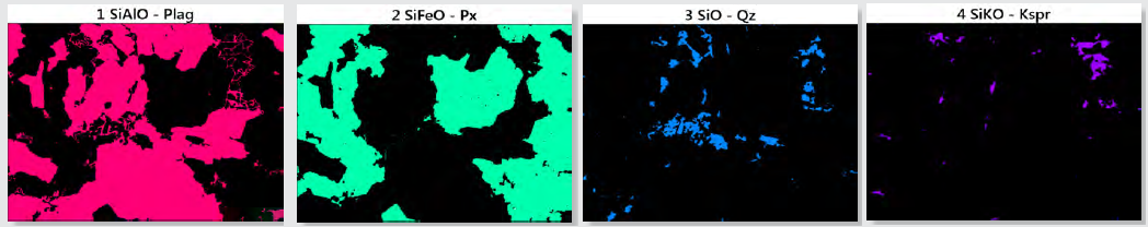 The AutoPhaseMap module of AZtec® finds different characteristic composition from X-ray map data, and determines the distribution, area, constituent elements and composition of each of these areas or phases. This technique can determine the modal percentages of different minerals in an igneous rock, and thus classify its type – but most importantly, the maps produced allow for some great cloud watching, or more appropriately: rock watching.