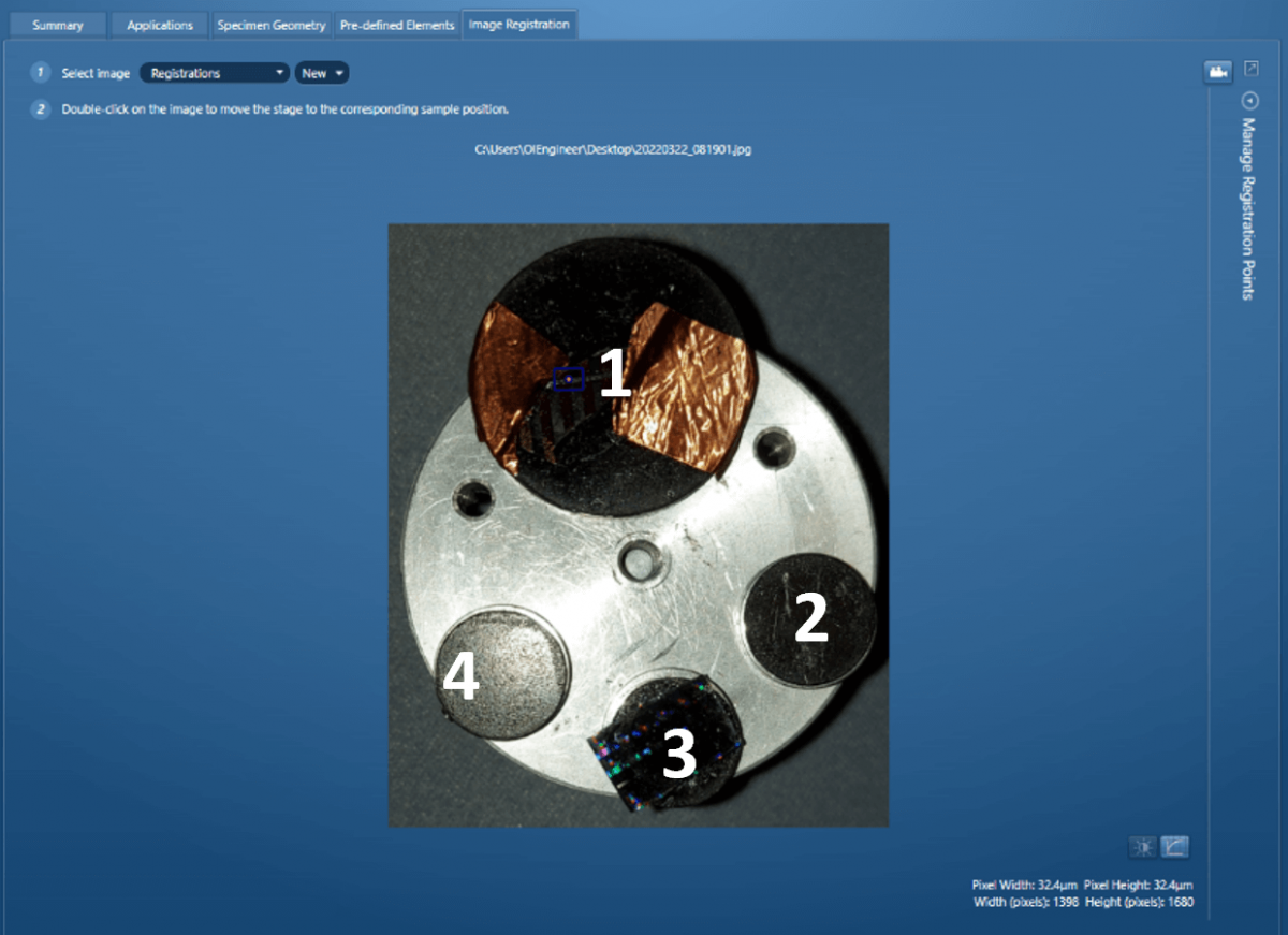 Using this image, AZtecLive’s image registration tool allows me to navigate around – something that is particularly useful when you’ve got multiple samples in the microscope, as here.