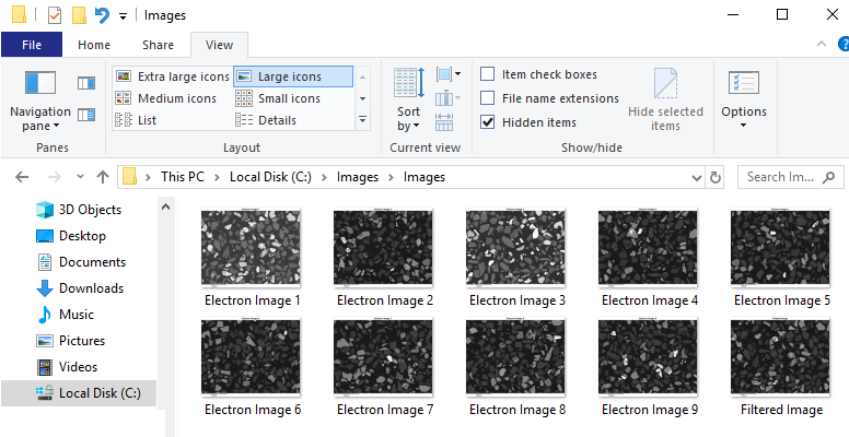 Once you’ve chosen the export folder, press start and watch the progression. When finished, there will be a message box telling you how many images were saved. Now when you look in the export folder, you will see all the electron images you requested.