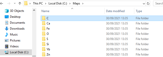 After the export is complete, you will see that element folders have been created in your destination folder. If you look in the Fe folder, you will see the Iron (Fe) maps from all the sites.
