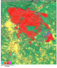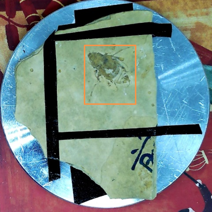 Figure 1 – To the left, photo of beetle fossil sample with the area of interest is marked by the orange rectangle and to the right the acquired chemical map.