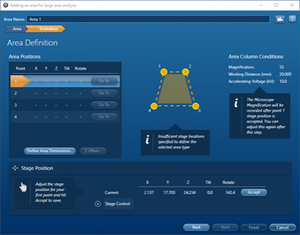 During the data acquisition, AZtec is moving the sample from field to field automatically, so it is important that the sample is positioned in a way so that these movements are safe. During the initial setup, typically 4 points are defined on the sample surface (x,y,z) allowing AZtec to calculate how the z-axis on the stage should be adjusted to keep the sample surface in focus while moving the x,y axis to shift the stage between fields of view. This is important, as otherwise the sample would potentially move out of focus if the sample surface was not mounted parallel to the SEM stage.