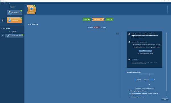 Figure 5 - User facing stage calibration step, where sample is moved along one axis and image correlation is used to identify the relation between stage x,y movements and the orientation of the electron image.
