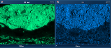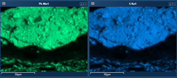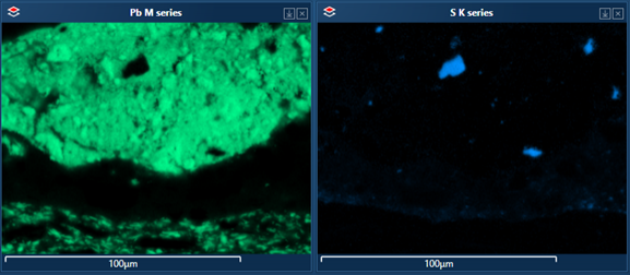 Fig. 7: Pb M series and S K series TruMaps, display the correct location of S via the applied algorithm deconvolution of overlapping peaks and reduced background fluctuations.