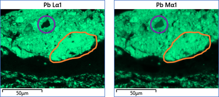Fig. 4: Left – Pb Lα1 map higher energy X-rays have a longer mean free path and a deeper interaction volume, but less background intensity. Right – Pb Mα1map lower energy X-rays have a shorter mean free path and a smaller interaction volume, but more background intensity. Colors – The orange highlight shows effect of interaction volume. The purple highlight shows effect of lower background in L-alpha map.