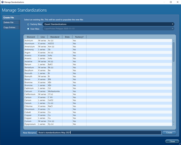 To copy a factory standardisations database, click the ‘Manage’ button on the bottom right of the screen (see above figure). This will open a wizard (see figure below). In the ‘Create File’ tab select the database you wish to copy (e.g., Factory files - ‘Quant Standardisations’) and enter a new filename at the bottom (e.g., ‘Rosie’s standardisations May 2021’). Then hit the ‘Create’ button.