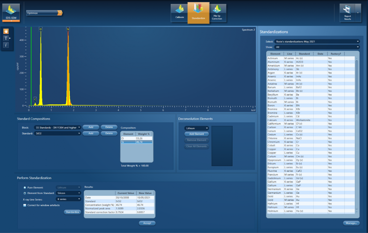 To define an EDS spectrum collected from a standard material as a standardisation, navigate to the EDS-SEM > Optimize > Standardise
