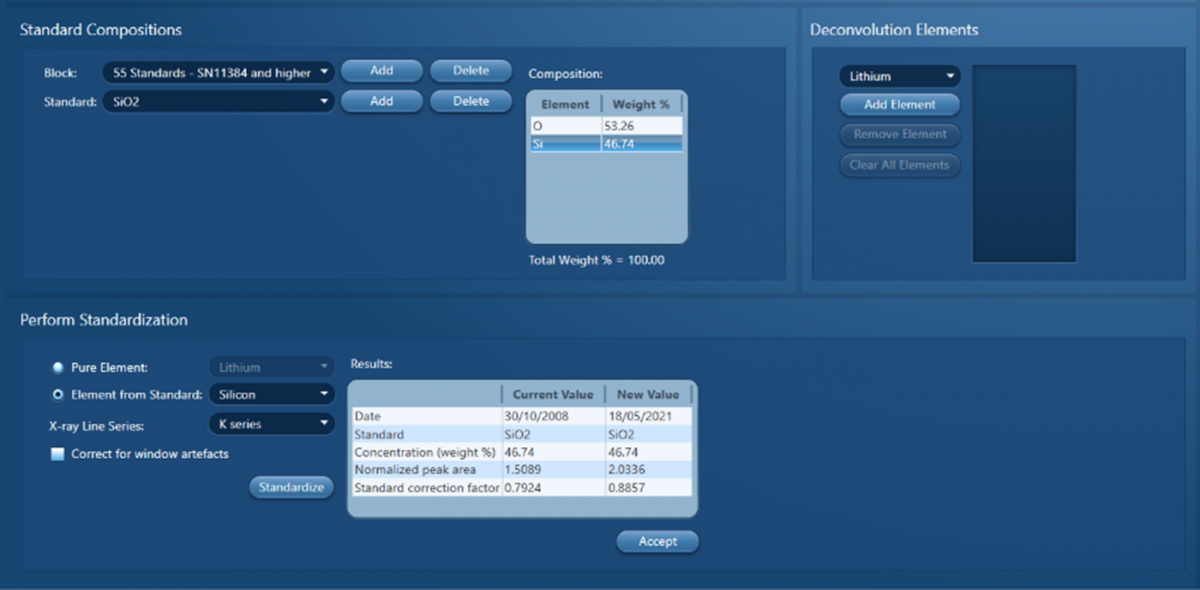 In this example I want to make a new standardisation for silicon. In the ‘Perform Standardisation’ section (see figure above), I have checked ‘Element for Standard’, as this standard material is not a pure element, and I have selected silicon from the drop-down list. I have selected the line series that I wish to standardise (in this case the K series) and have pressed the ‘Standardise’ button. The results table then shows the difference between the factory standardisation in the database and the new measurement. Pressing the ‘Accept’ button will populate the selected standardisations database with this new standardisation.