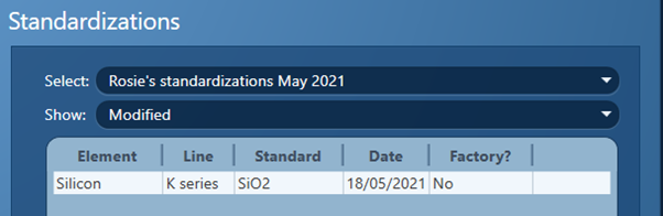 The figure below shows the new, modified silicon standardisation in the standardisations database (Rosie’s standardisations May 2021). Note that it shows the date that standardisation was made and that this is not a factory standardisation.