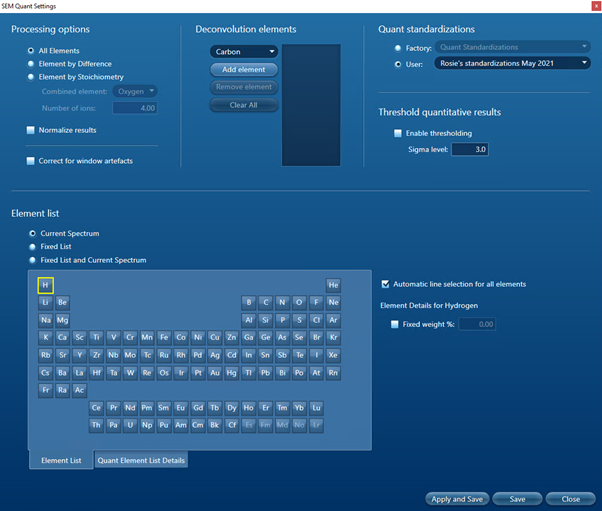 Finally, to generate quantitative EDS results for unknown samples using this new standardisation database, you just need to select it from the drop-down list of ‘User’ Quant standardisations in the SEM Quant settings and hit ‘Apply and Save’ (see figure below).