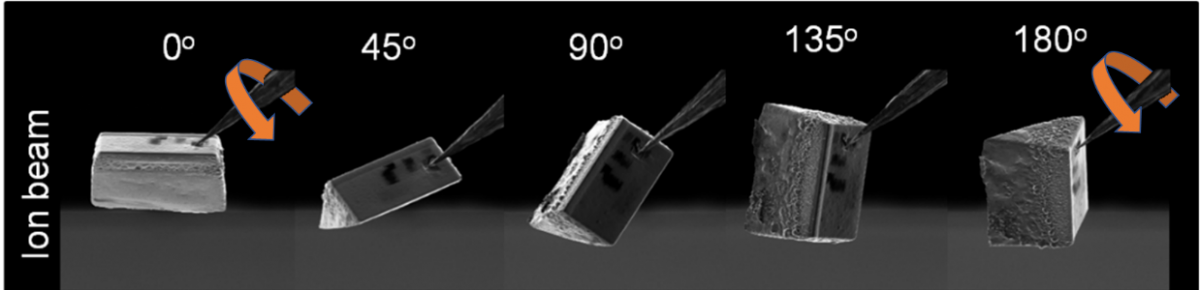 Sequence of ion beam images showing a sample rotation of 180° with an OmniProbe