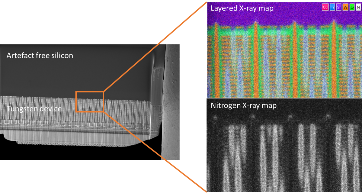 Same semiconductor device as above but inverted before milling. The silicon is artefact free, enabling the high-resolution EDS map acquired with an Extreme X-ray detector, to identify nitrogen at the bottom of the tungsten via’s.