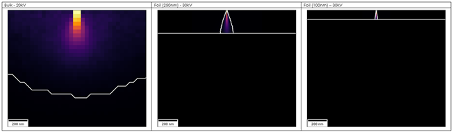 As part of our studies into these challenges, we are also starting to consider in greater depth the potential capability of a different method that allows us to use high-kV for quantitative analysis on nano-structures. This is done by analysing a thin lamella rather than a bulk sample, so called SEM-STEM or 30kV STEM. It’s a somewhat mis-leading term, as a STEM detector is not a requirement, but it takes advantage of the much smaller volume of interaction when an electron beam interacts with a thin sample / lamella at high kV. I attempt to show this using simulations of sample – beam interaction in Figure 1.
