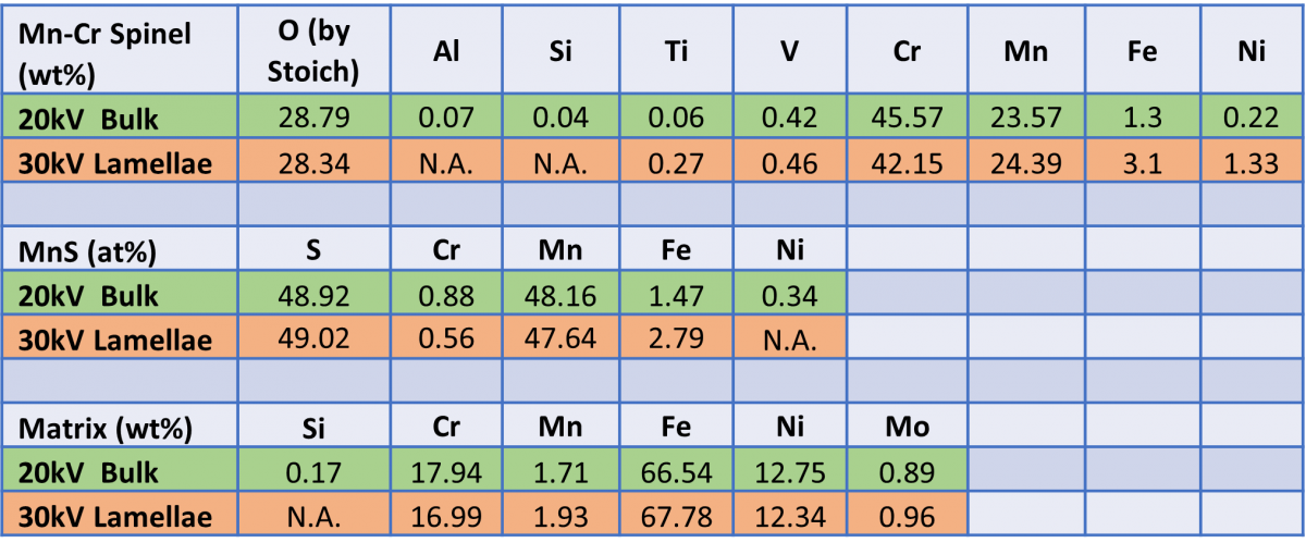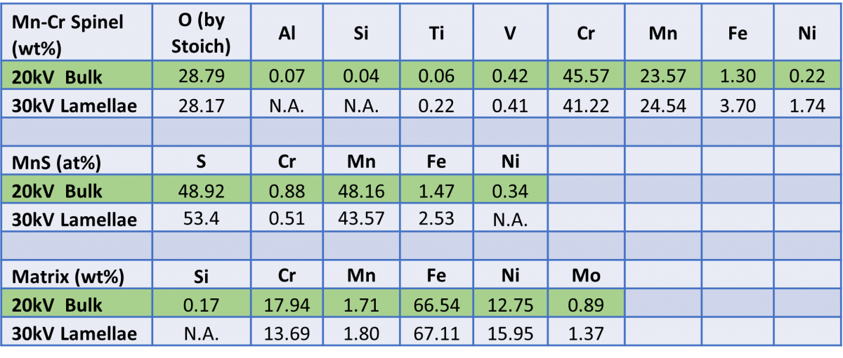 In Table 1, I compare the 20kV bulk composition (in green) with what I calculate by using the same bulk standardless quantification method on the phases in the lamella. This approach makes an incorrect assumption that the complete electron beam interaction is within the sample, the lamella is in fact semi-transparent to 30kV electrons and most are transmitted through the sample. Still, the results look encouraging and give at least an approximation of the sample composition. However, looking in detail, we have over-estimations in the heavier elements and under-estimations in the lighter ones.