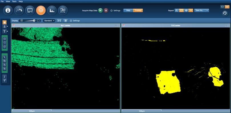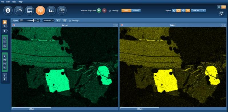To eliminate this issue, we created TruMap, which generates element maps that correct for peak overlaps and remove any background anomalies. We can see that running TruMap on the same sample now shows a very different picture for the distributions of Ba and Ti.