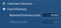 - Enter a nominal thickness (nm) for any layers in the model where the thickness is set as an unknown (as shown below). LayerProbe will start iterating from the nominal thickness to find a solution, so the closer the nominal value is to reality the more quickly LayerProbe will home in on a solution.